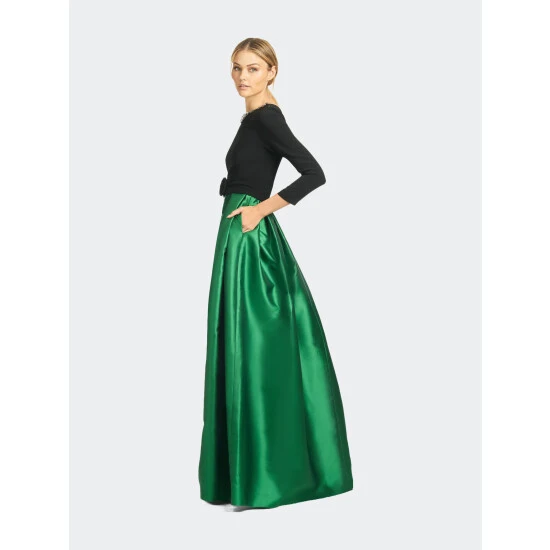 Elegant. Grande. Gorgeous. These are all the words that come to mind when they look at this classic ball down. What really love about this dress, which is everything, if they had to highlight something, it would be the bodice. The jet black top of this dress is in the “Magical” 4-way stretch crepe that flatters and hugs you while being incredibly comfortable. At the neck, a faceted bib necklace, and at the waist a self-tie sash. The skirt is a flash of intensely stunning color in Mikado.